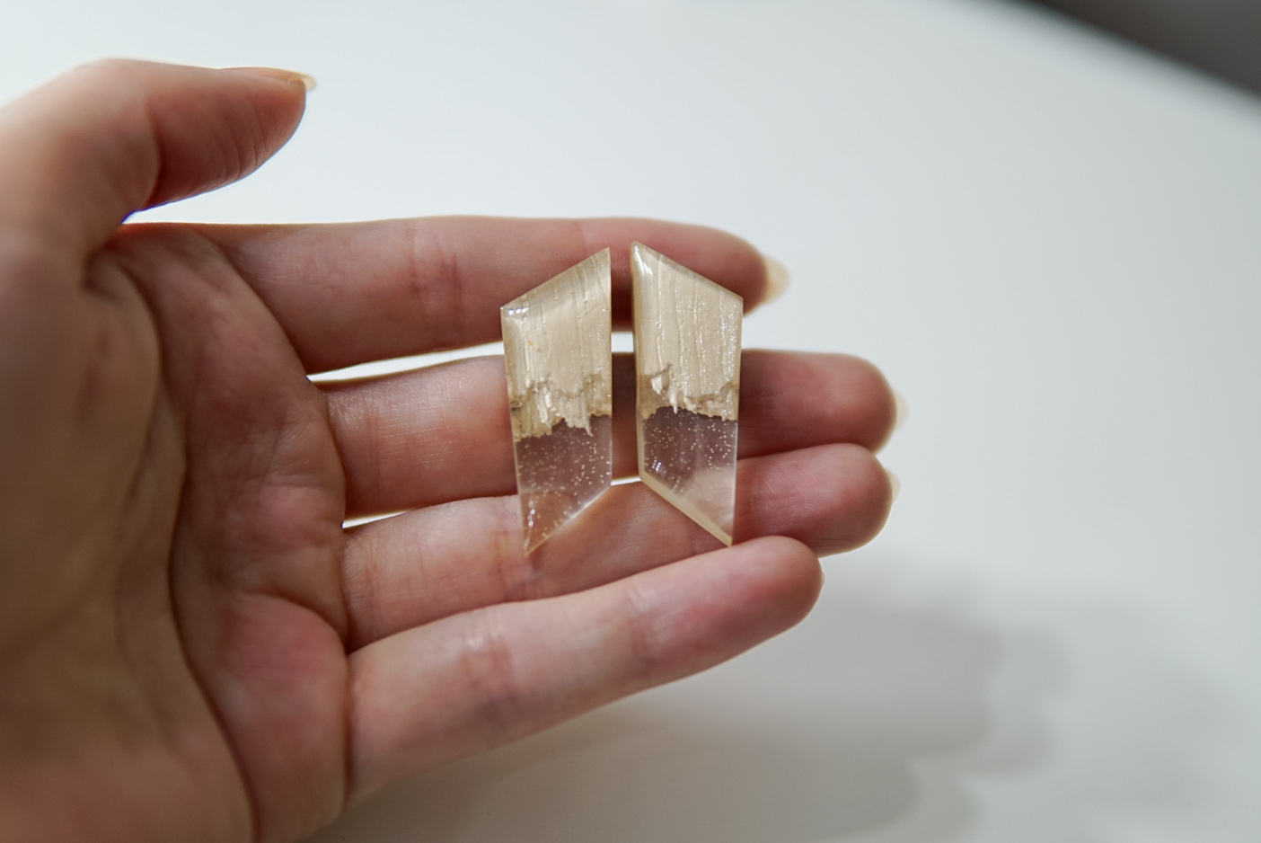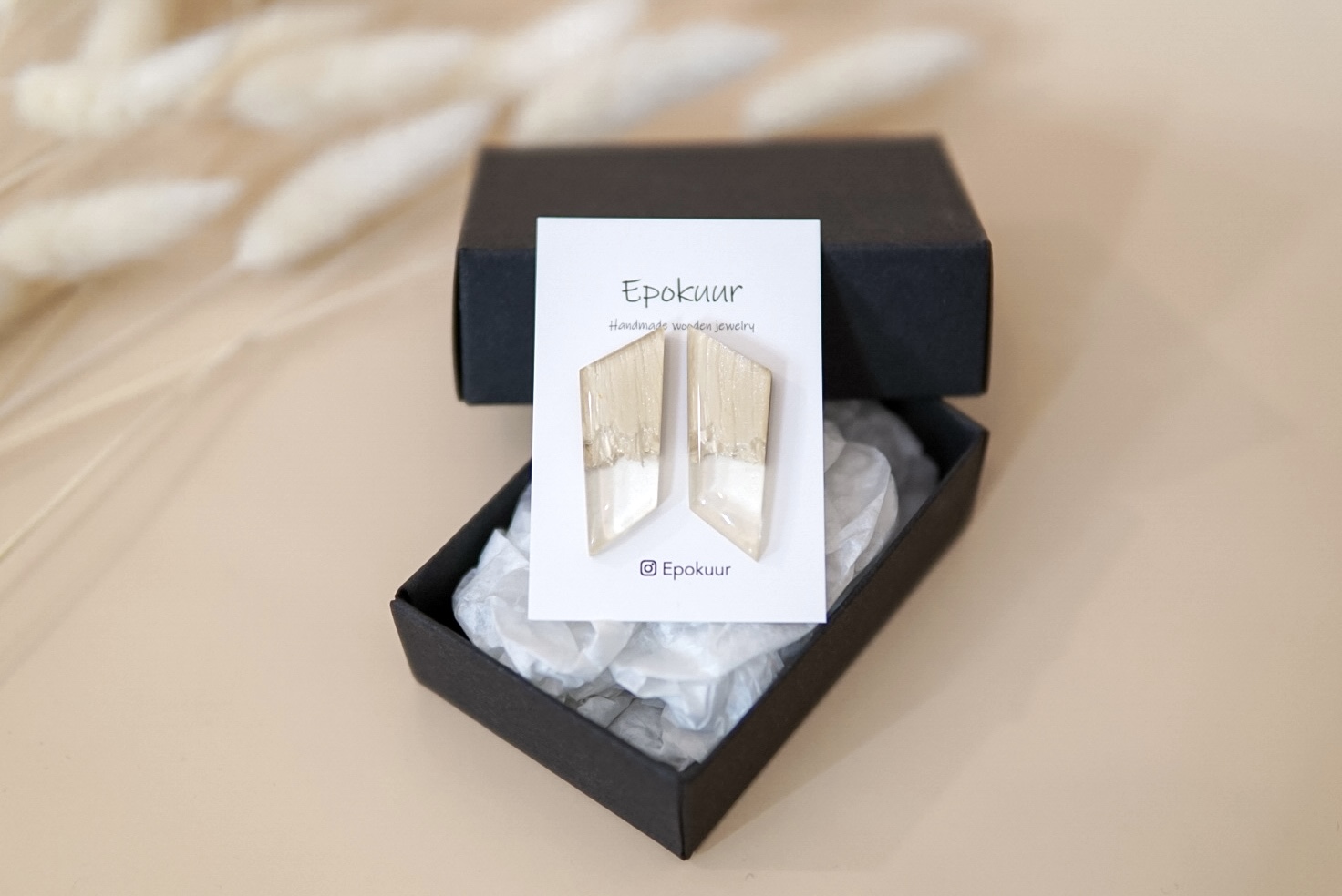 Käsitööna epoksiidvaigust ja tammepuidust valmistatud valged pärlmutter kõrvarõngad. Kõrvarõngaste pikkus on ca 3,5 cm, laius 1,5 cm ja paksus 0,4 cm. Kõrvarõngaste tagused on roostevabast terasest (nikli vabad).