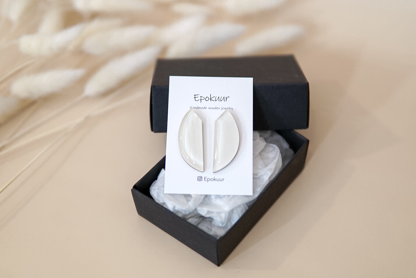 Käsitööna epoksiidvaigust ja tammepuidust valmistatud valged õrna sädelusega kõrvarõngad. Kõrvarõngaste pikkus on ca 3,5 cm, laius 1,5 cm ja paksus 0,4 cm. Kõrvarõngaste tagused on roostevabast terasest (nikli vabad).