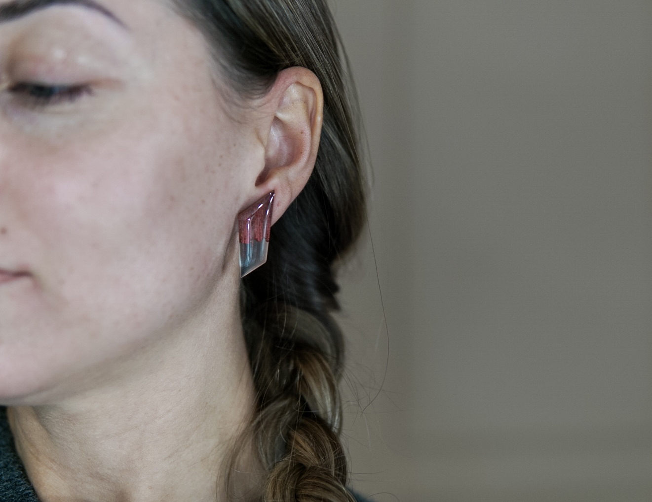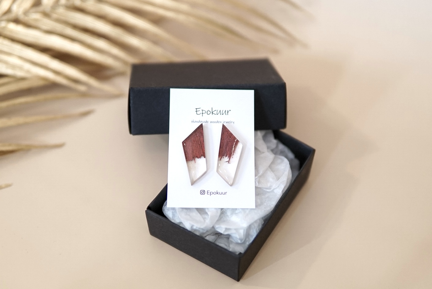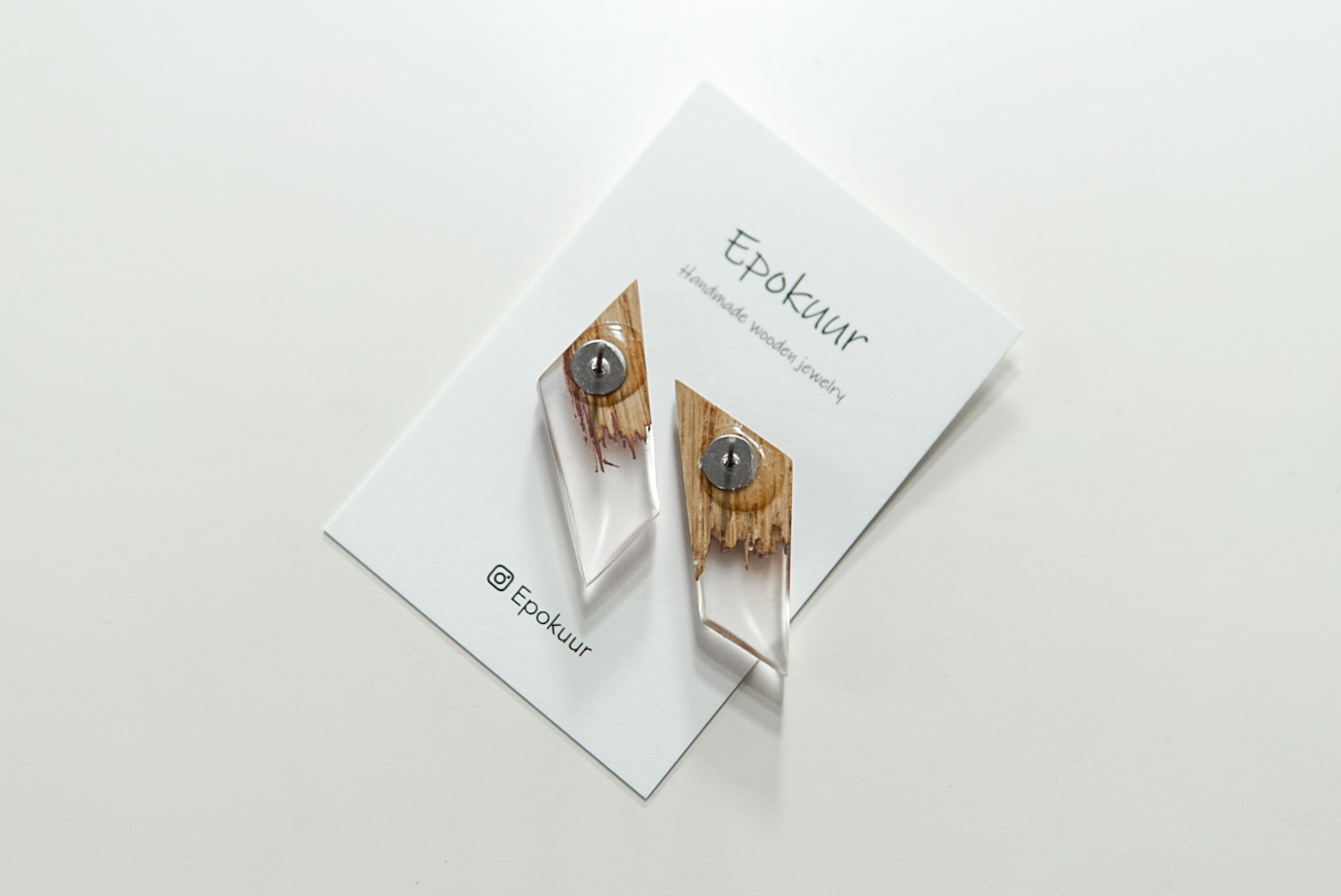 Käsitööna epoksiidvaigust ja tammepuidust valmistatud pruunid sädelevad kõrvarõngad. Kõrvarõngaste pikkus on ca 3,5 cm, laius 1,2 cm ja paksus 0,4 cm. Kõrvarõngaste tagused on roostevabast terasest (nikli vabad).