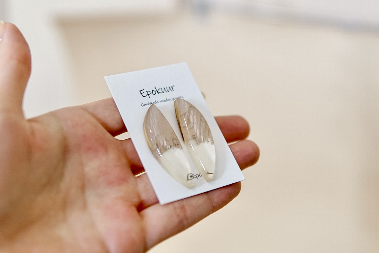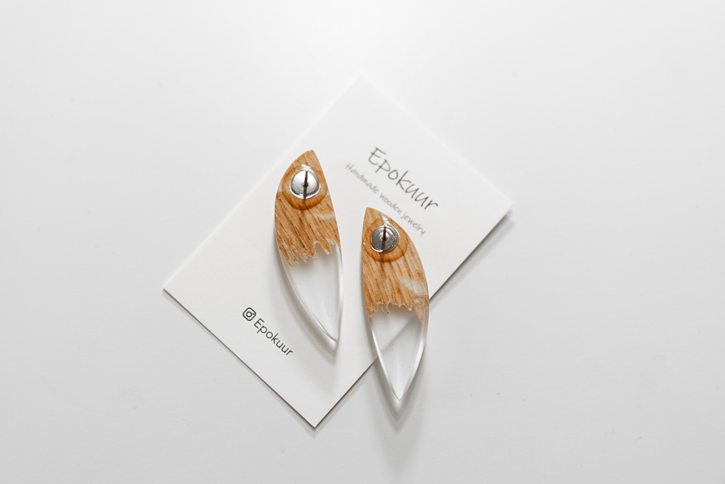 Käsitööna epoksiidvaigust ja tammepuidust valmistatud heledad kõrvarõngad. Kõrvarõngaste pikkus on ca 4 cm, laius 1,4 cm ja paksus 0,4 cm. Kõrvarõngaste tagused on roostevabast terasest (nikli vabad).