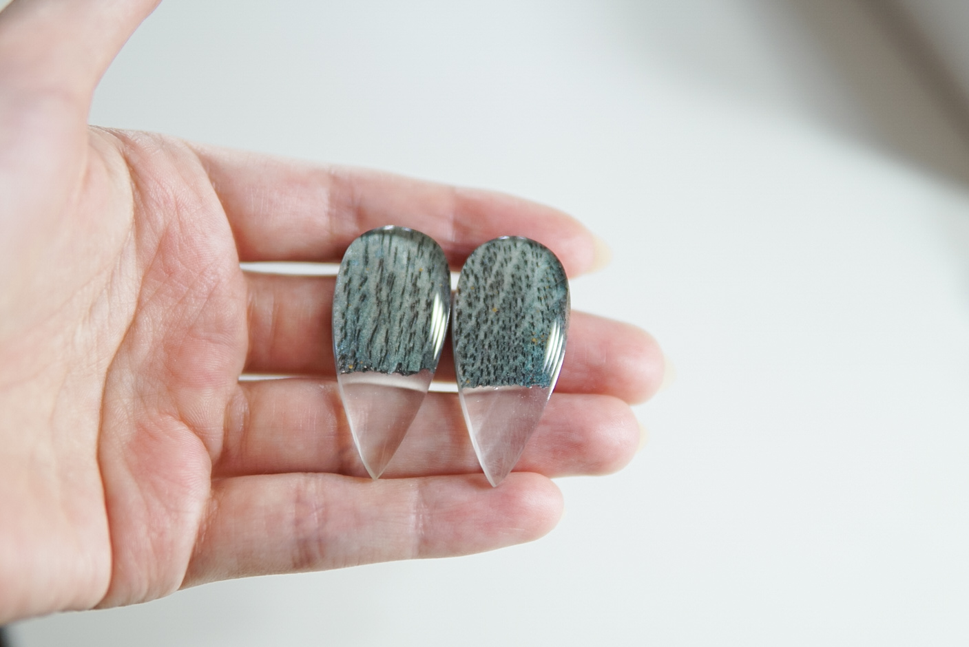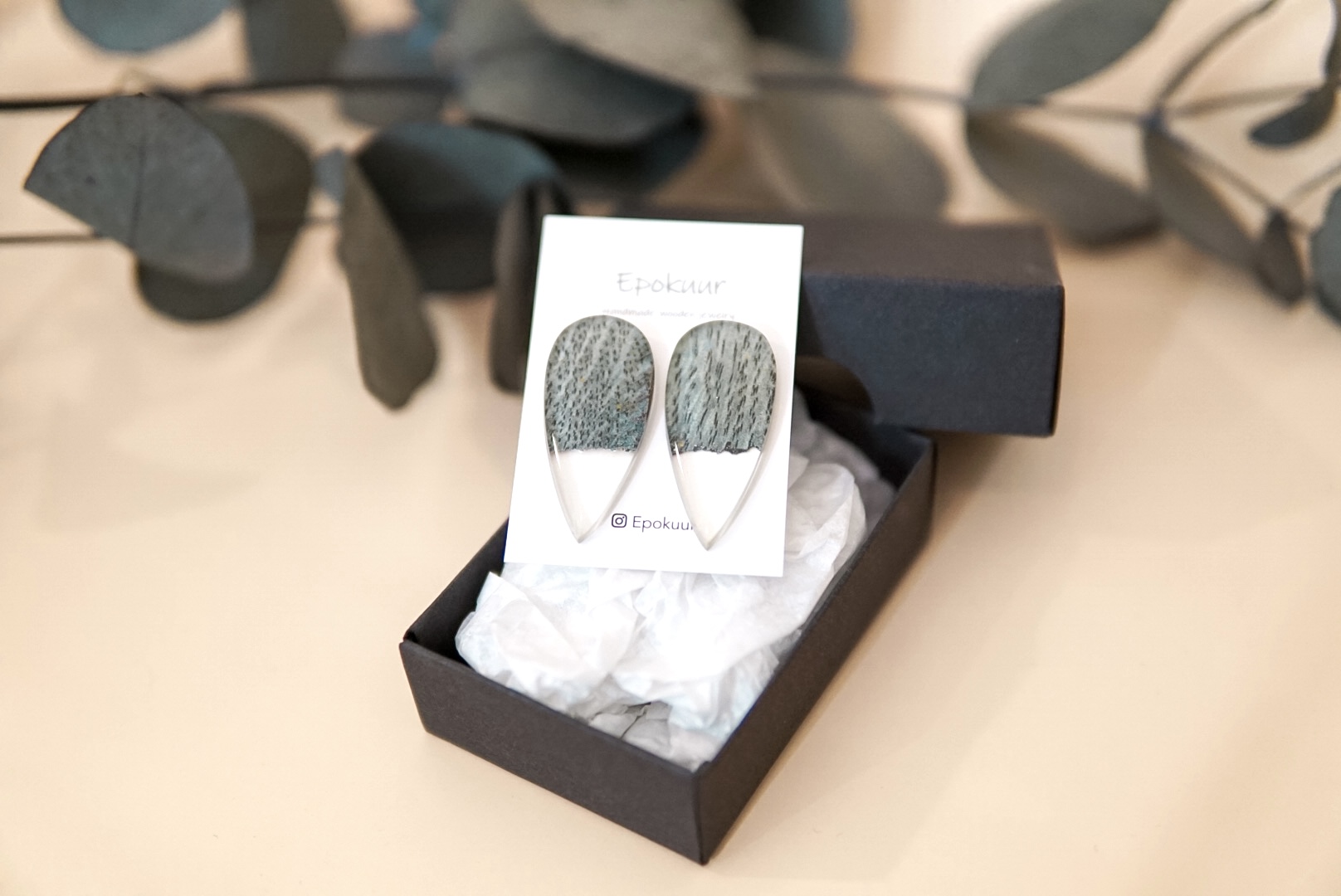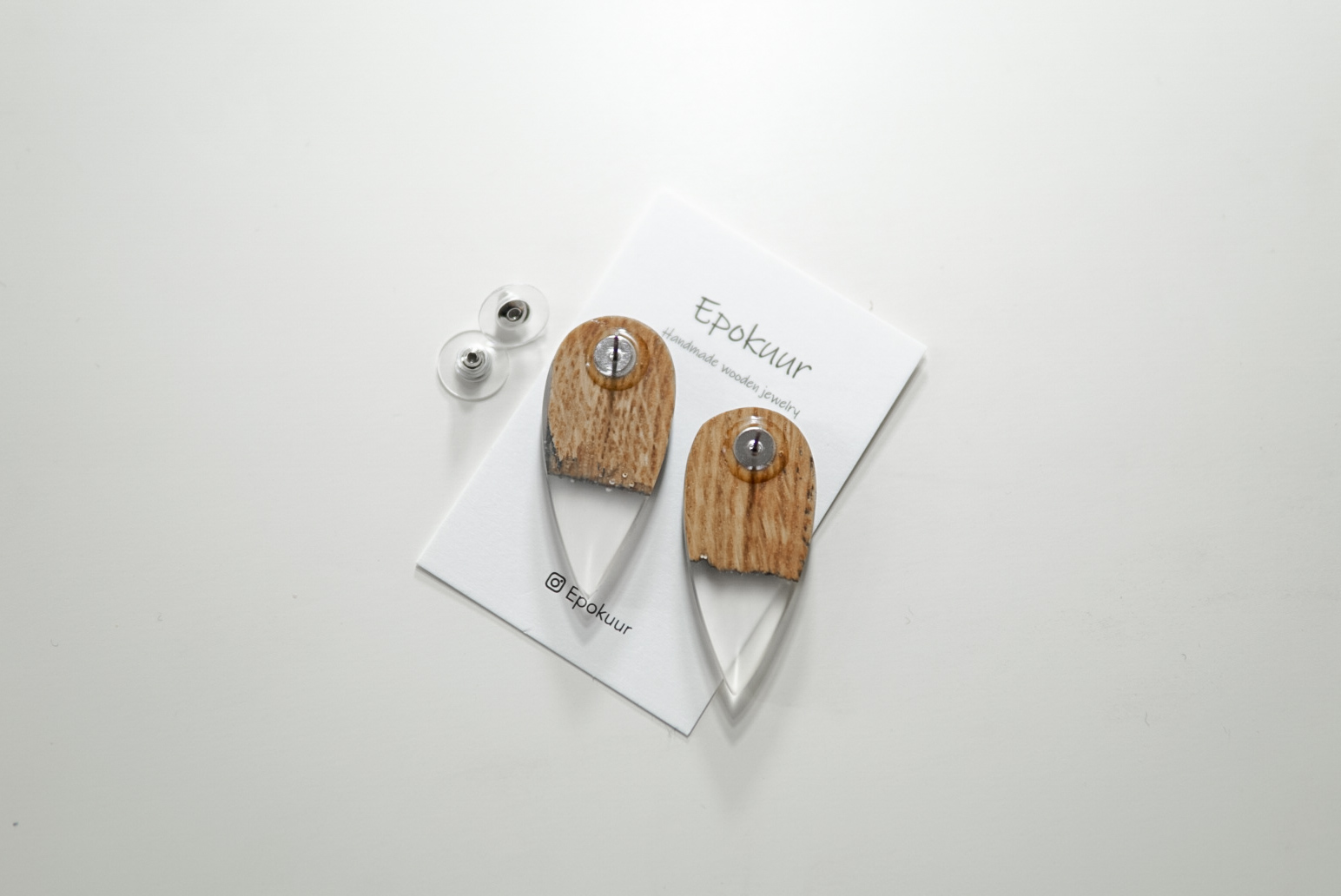 Käsitööna epoksiidvaigust ja tammepuidust valmistatud hallikad sädelevad kõrvarõngad. Kõrvarõngaste pikkus on ca 4 cm, laius 1,8 cm ja paksus 0,4 cm. Kõrvarõngaste tagused on roostevabast terasest (nikli vabad).