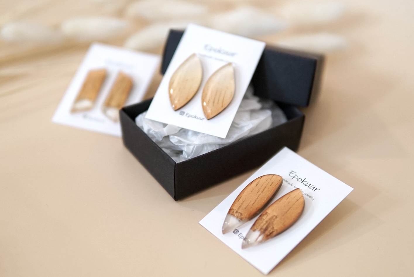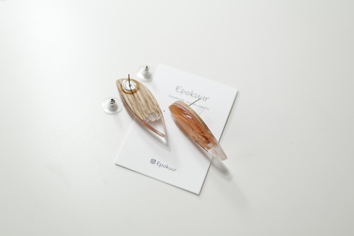 Käsitööna epoksiidvaigust ja tammepuidust valmistatud oranžikad kõrvarõngad. Kõrvarõngaste pikkus on ca 4 cm, laius 1,5 cm ja paksus 0,4 cm. Kõrvarõngaste tagused on roostevabast terasest (nikli vabad).