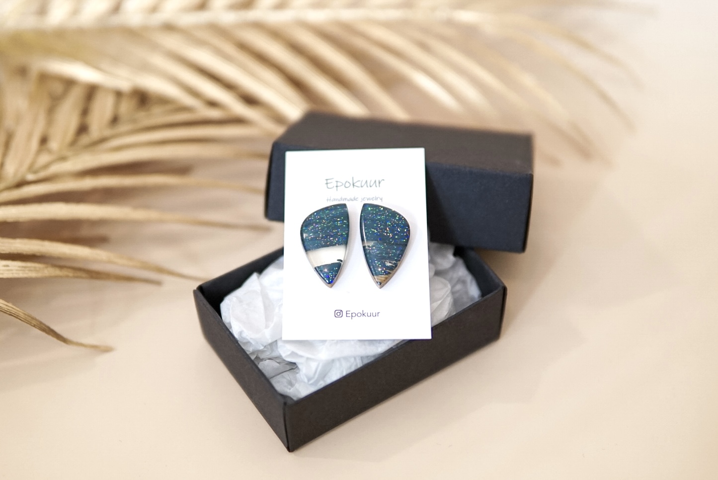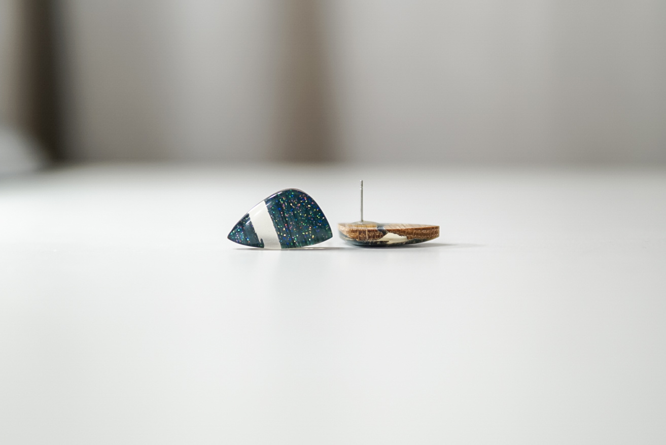 Käsitööna epoksiidvaigust ja tammepuidust valmistatud tumesinised sädelevad kõrvarõngad. Kõrvarõngaste pikkus on ca 2,5 cm, laius 1,5 cm ja paksus 0,4 cm. Kõrvarõngaste tagused on roostevabast terasest (nikli vabad).