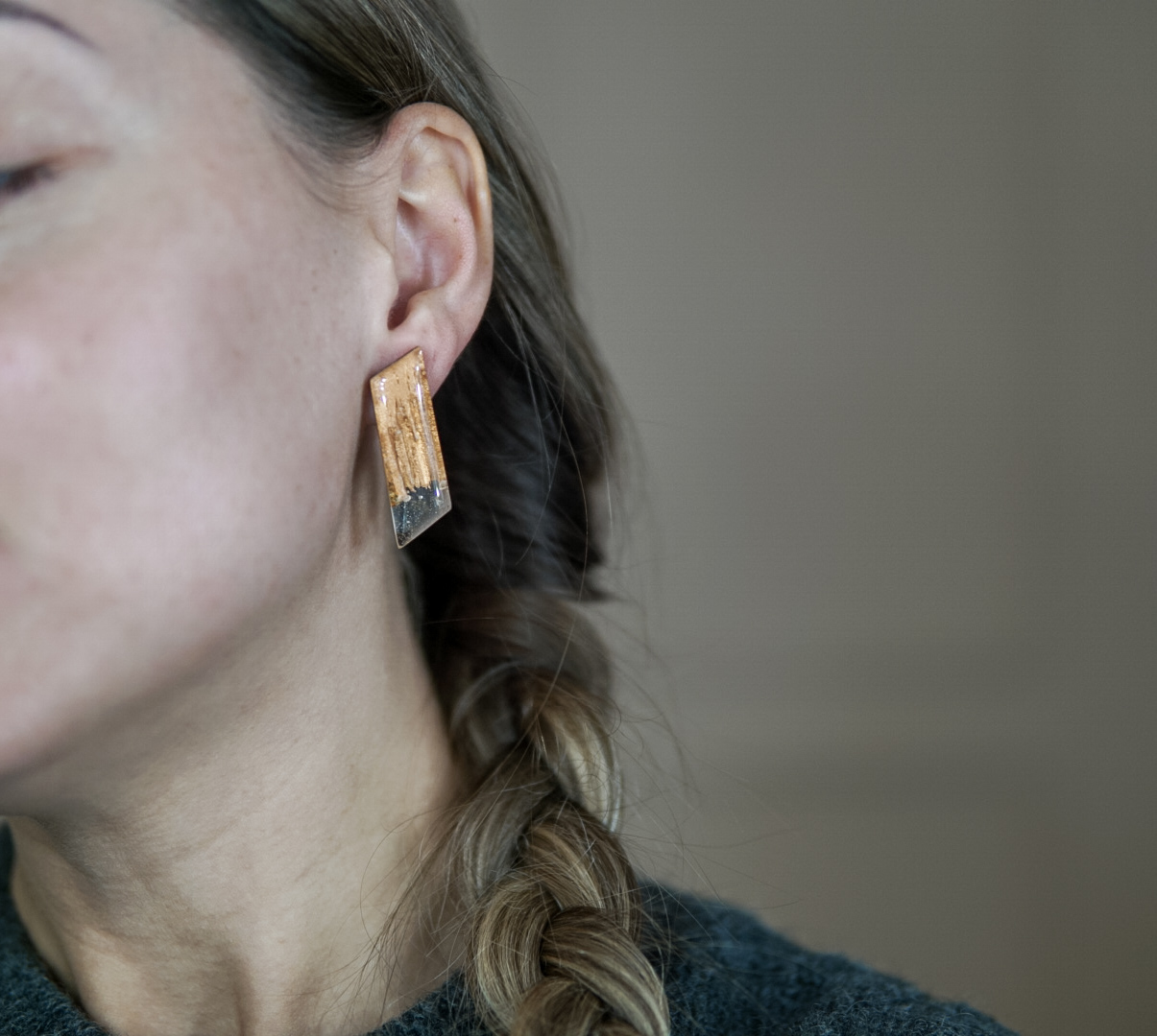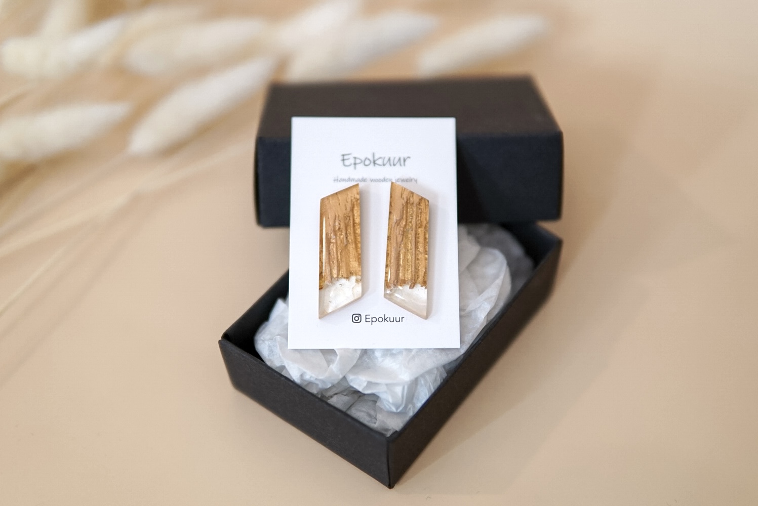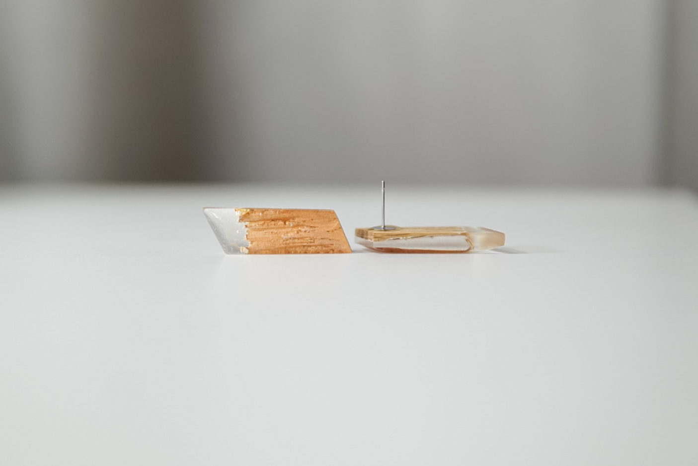 Käsitööna epoksiidvaigust ja tammepuidust valmistatud heledad kõrvarõngad. Kõrvarõngaste pikkus on ca 3,5 cm, laius 1,2 cm ja paksus 0,4 cm. Kõrvarõngaste tagused on roostevabast terasest (nikli vabad).