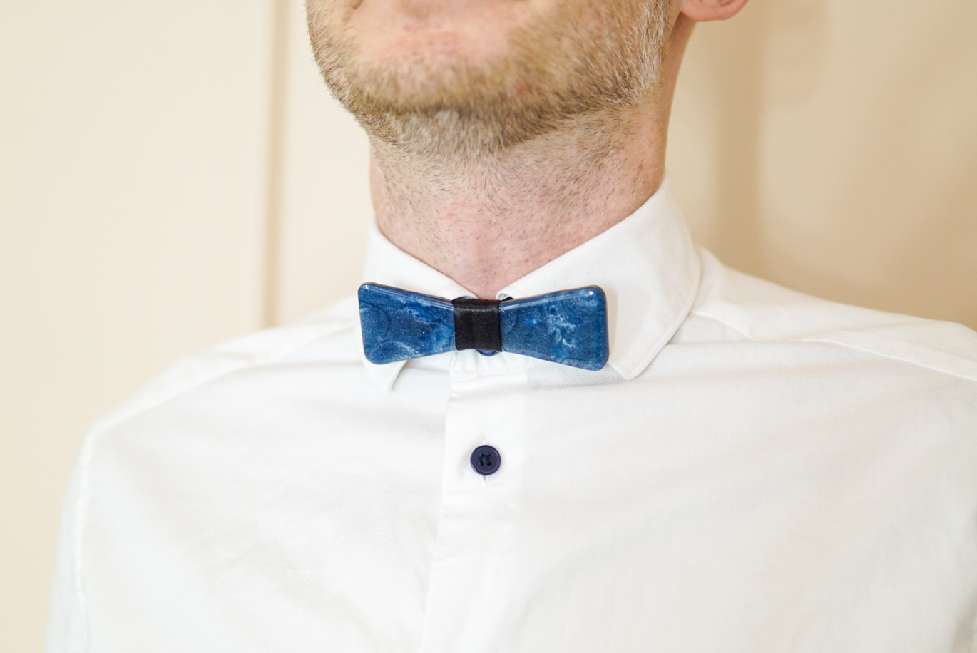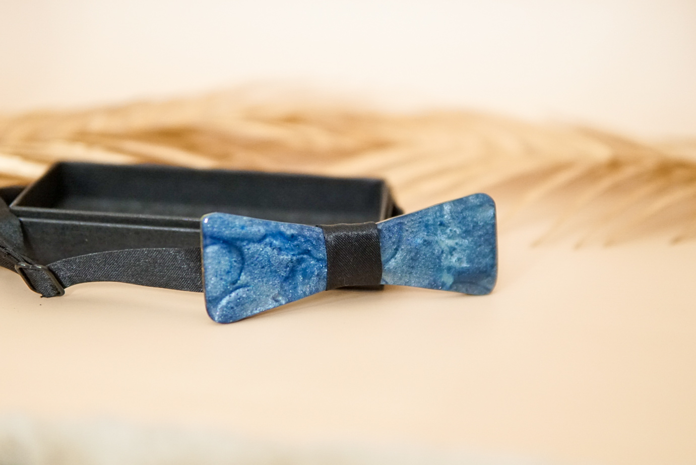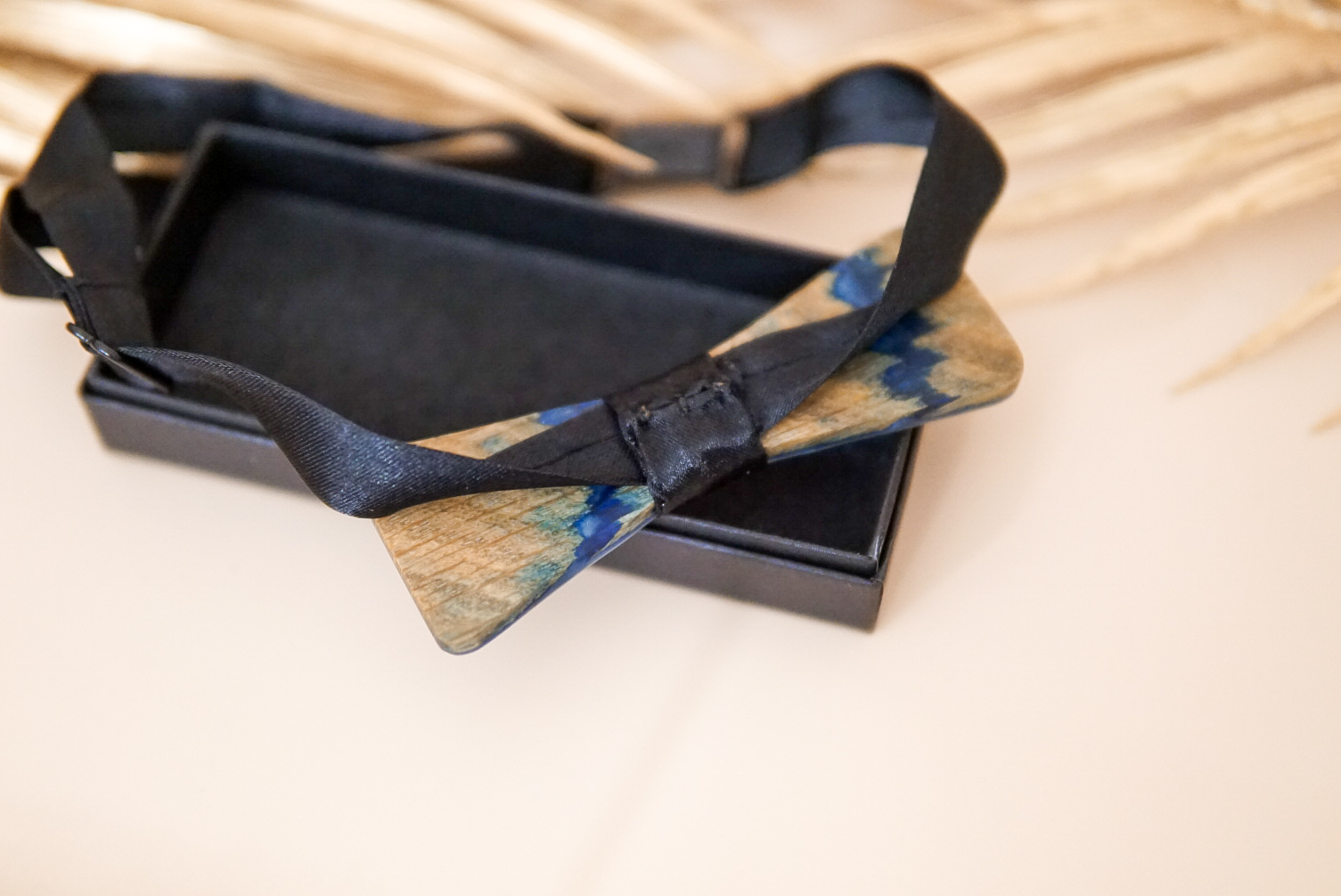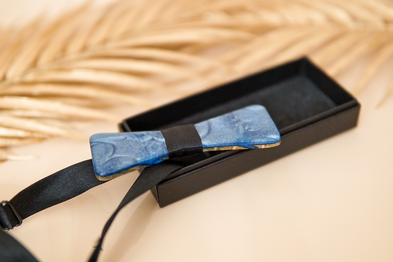 Käsitööna epoksiidvaigust ja tammepuidust valmistatud sinine kikilips. Kikilipsu laius on ca 10 cm, kõrgus 4 cm.