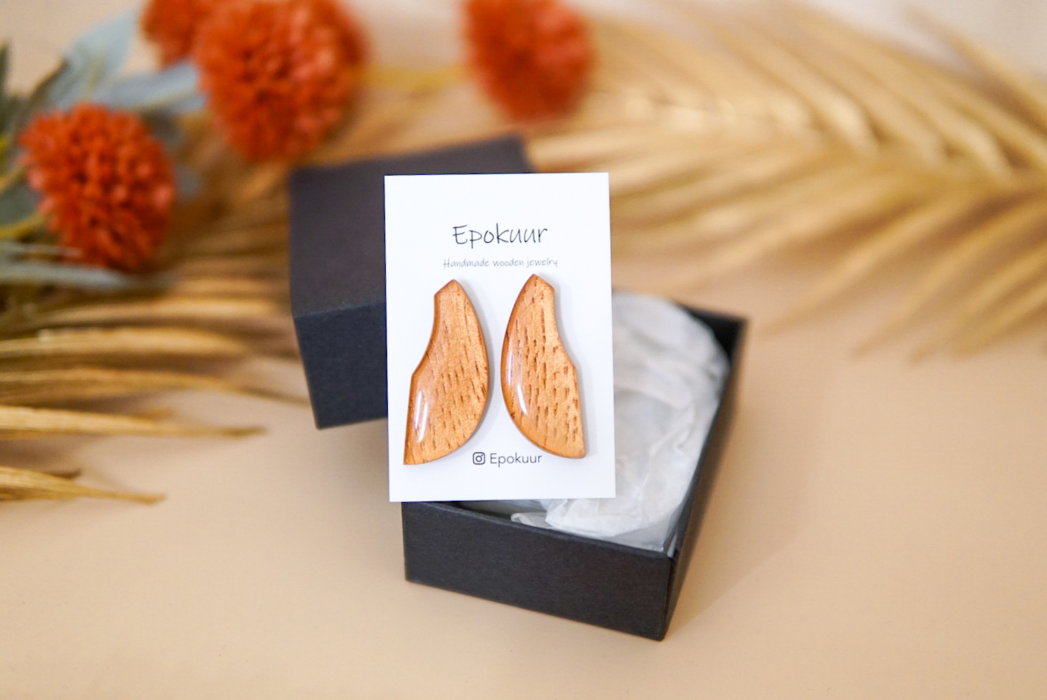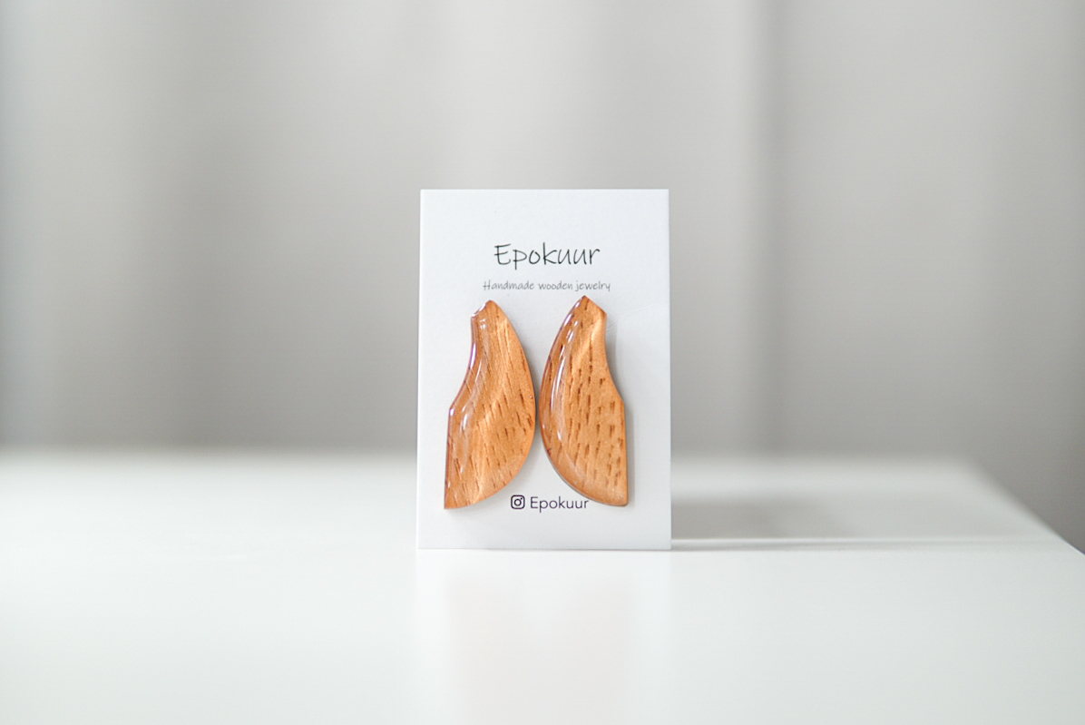 Käsitööna epoksiidvaigust ja tammepuidust valmistatud heleoranžikad kõrvarõngad. Kõrvarõngaste pikkus on ca 4 cm, laius 1,5 cm ja paksus 0,4 cm. Kõrvarõngaste tagused on roostevabast terasest (nikli vabad).