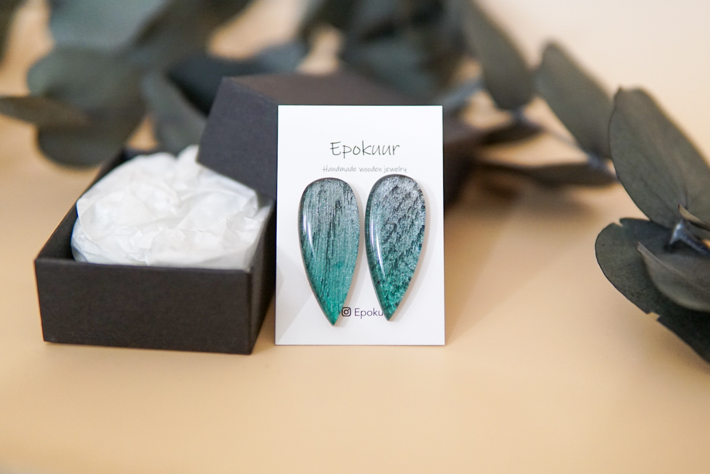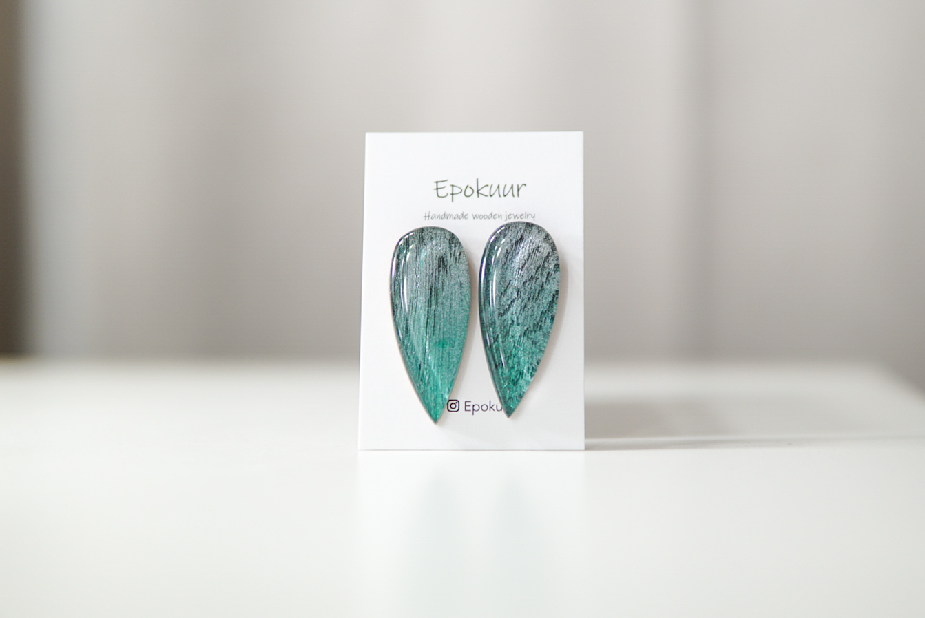 Käsitööna epoksiidvaigust ja tammepuidust valmistatud õrna sädelusega kõrvarõngad. Kõrvarõngaste pikkus on ca 4 cm, laius 1,5 cm ja paksus 0,4 cm. Kõrvarõngaste tagused on roostevabast terasest (nikli vabad).