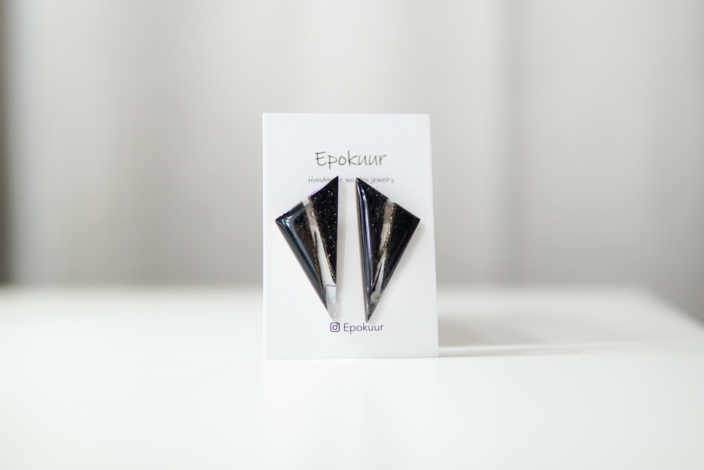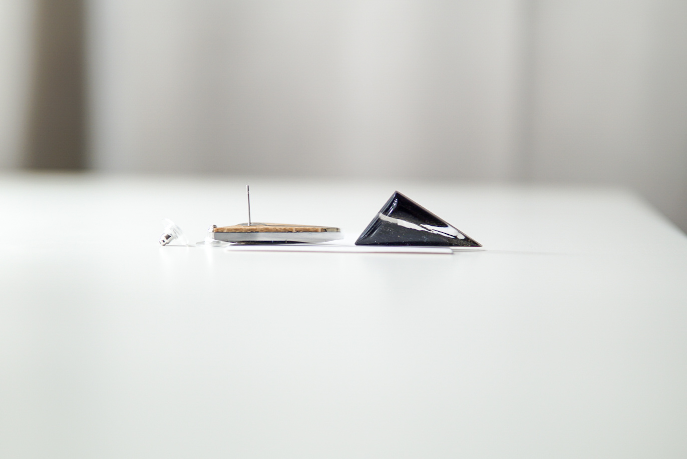 Käsitööna epoksiidvaigust ja tammepuidust valmistatud musta värvi kõrvarõngad. Kõrvarõngaste pikkus on ca 4,5 cm, laius 1,5 cm ja paksus 0,4 cm. Kõrvarõngaste tagused on roostevabast terasest (nikli vabad).