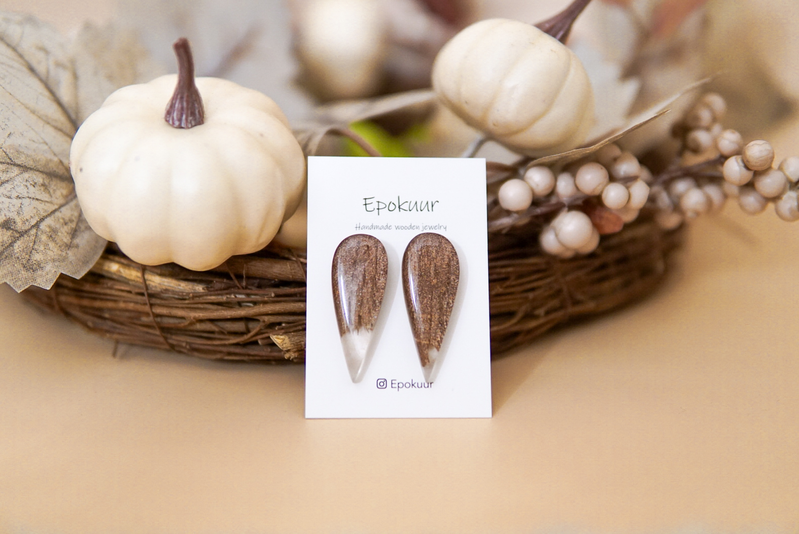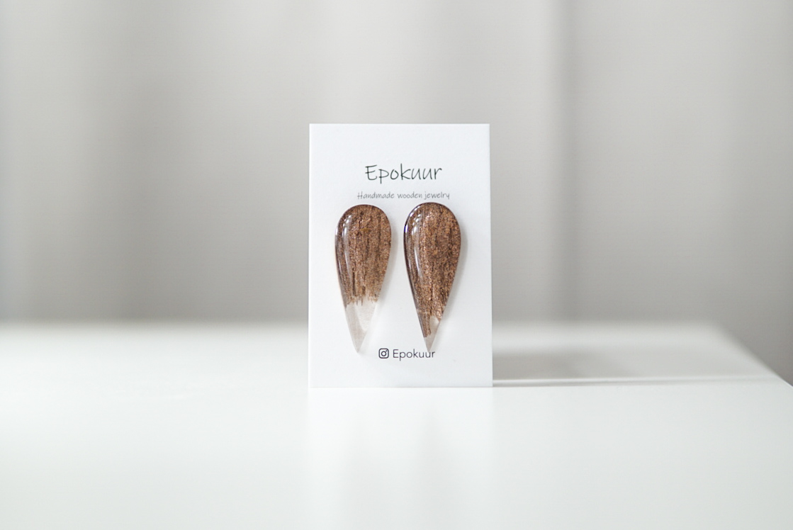 Käsitööna epoksiidvaigust ja tammepuidust valmistatud helepruunid õrna sädelusega kõrvarõngad. Kõrvarõngaste pikkus on ca 4,5 cm, laius 1,5 cm ja paksus 0,4 cm. Kõrvarõngaste tagused on roostevabast terasest (nikli vabad).