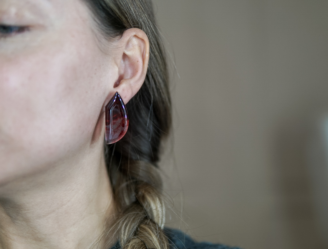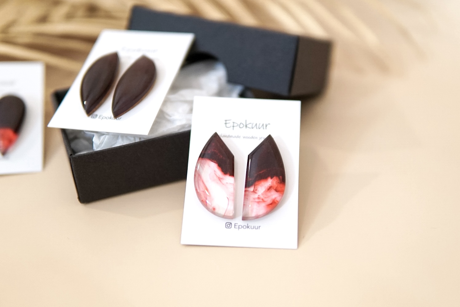 Käsitööna epoksiidvaigust ja tammepuidust valmistatud veinipunased õrna sädelusega kõrvarõngad. Kõrvarõngaste pikkus on ca 4 cm, laius 1,5 cm ja paksus 0,4 cm. Kõrvarõngaste tagused on roostevabast terasest (nikli vabad).