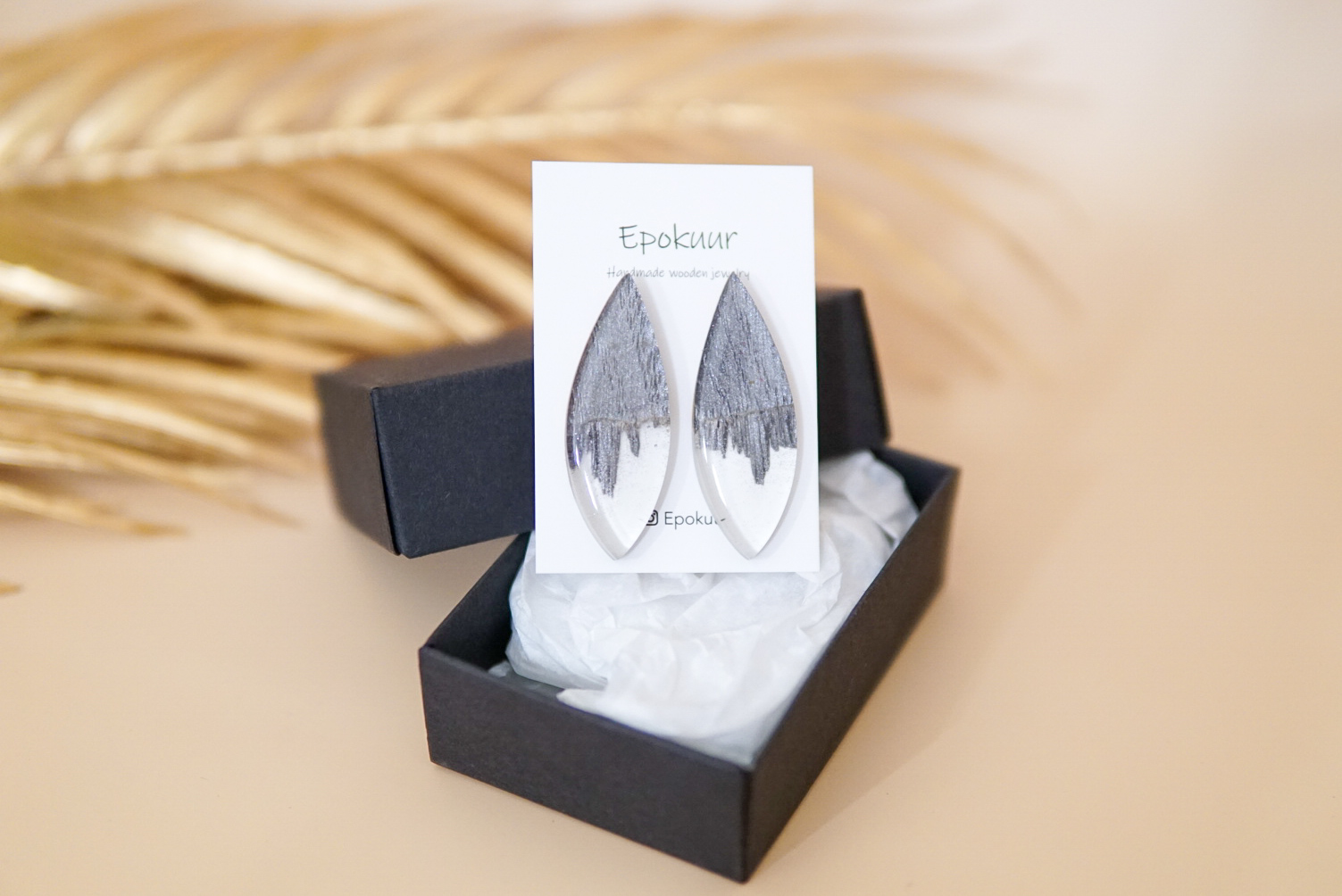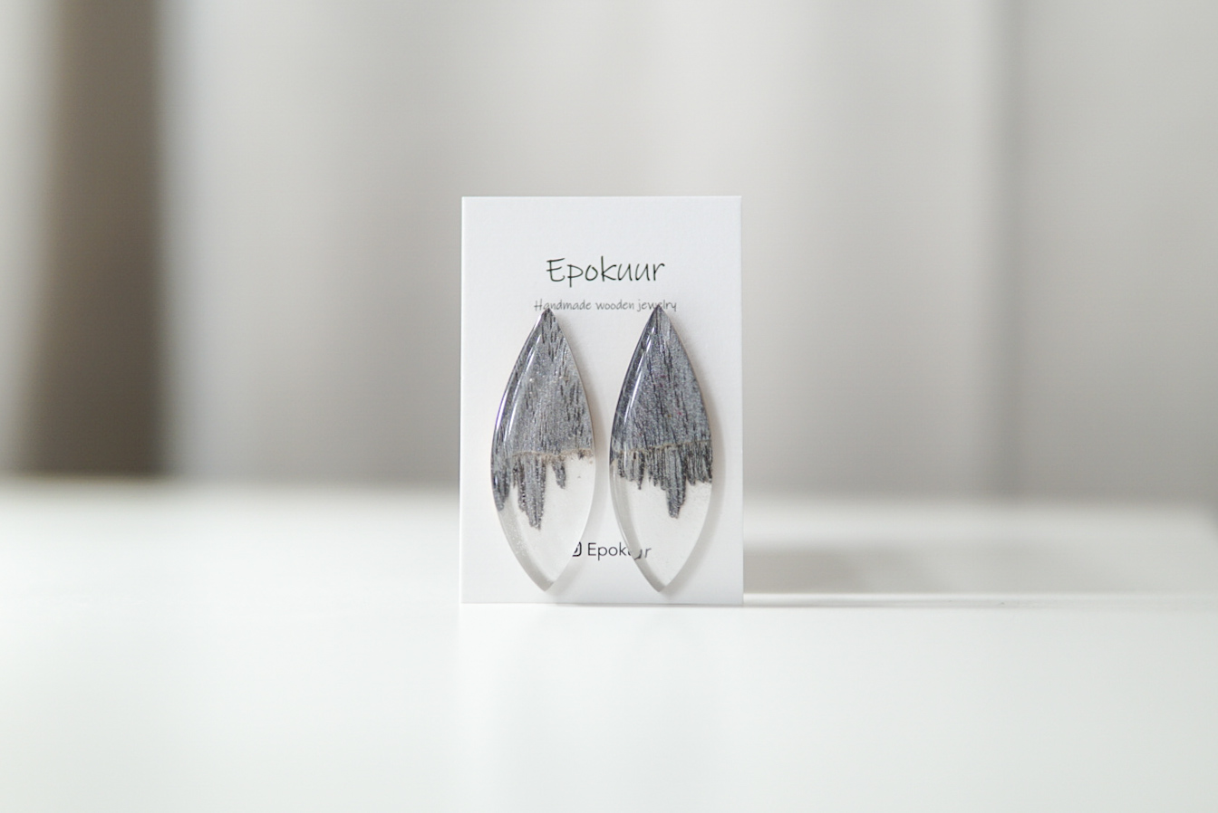 Käsitööna epoksiidvaigust ja tammepuidust valmistatud õrna sädelusega kõrvarõngad. Kõrvarõngaste pikkus on ca 4 cm, laius 1,5 cm ja paksus 0,4 cm. Kõrvarõngaste tagused on roostevabast terasest (nikli vabad).