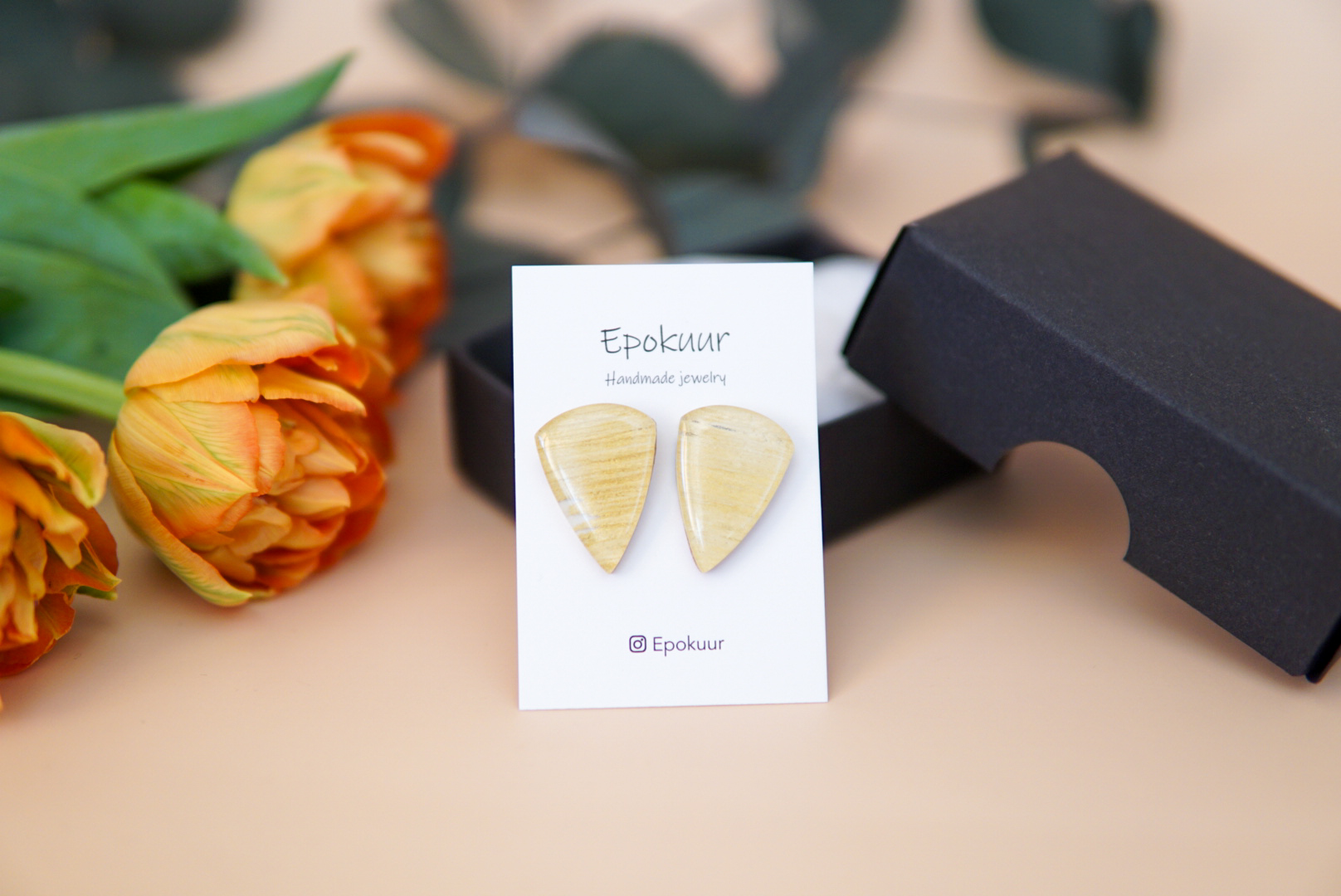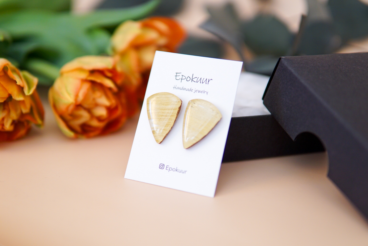 Käsitööna epoksiidvaigust ja tammepuidust valmistatud helekollased kõrvarõngad. Kõrvarõngaste pikkus on ca 2,5 cm, laius 2 cm ja paksus 0,4 cm. Kõrvarõngaste tagused on roostevabast terasest (nikli vabad).