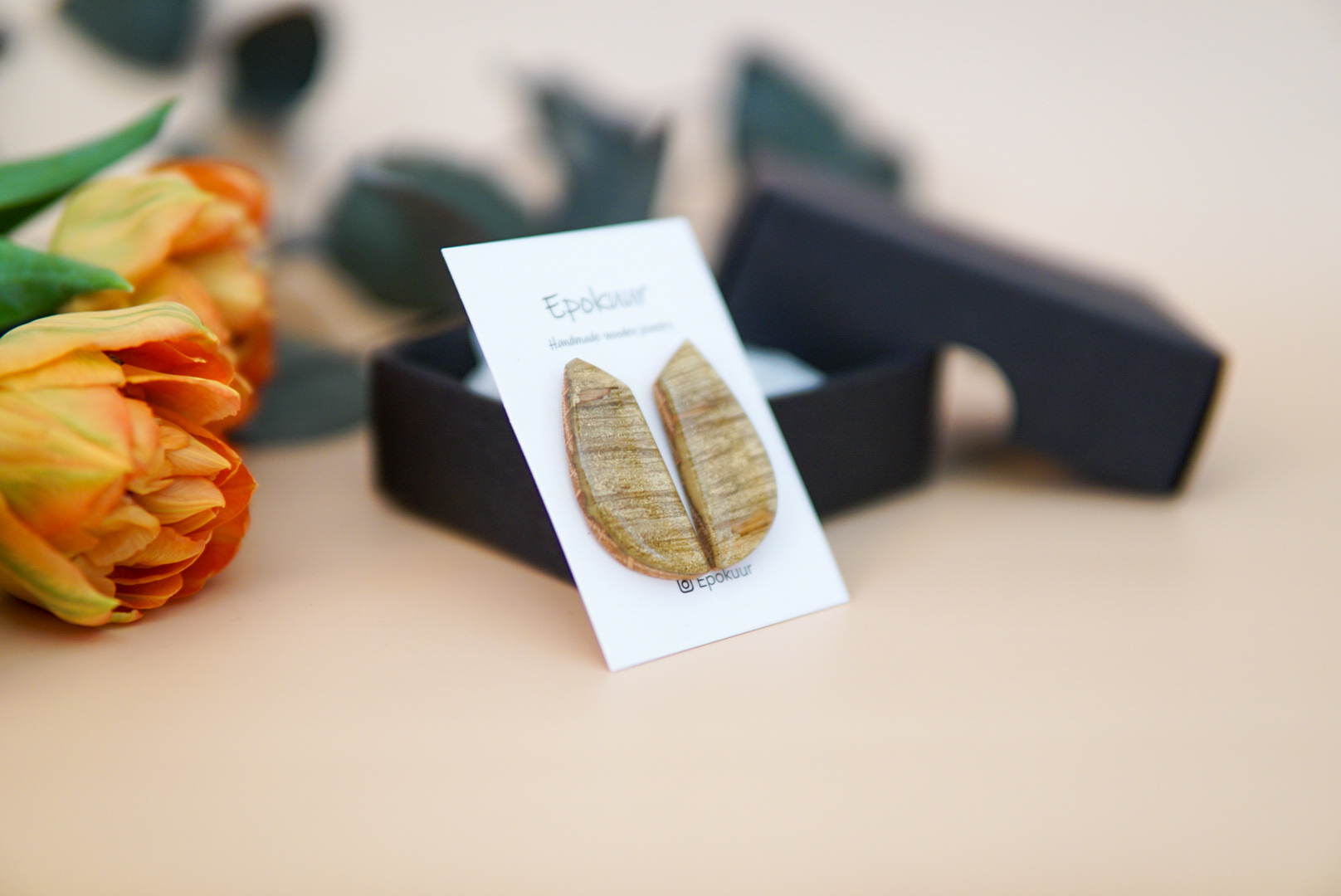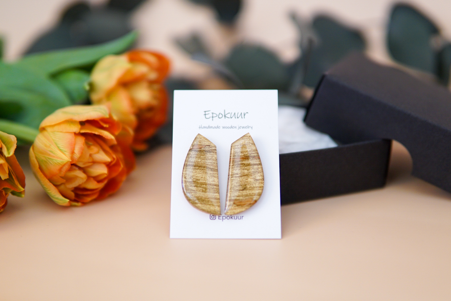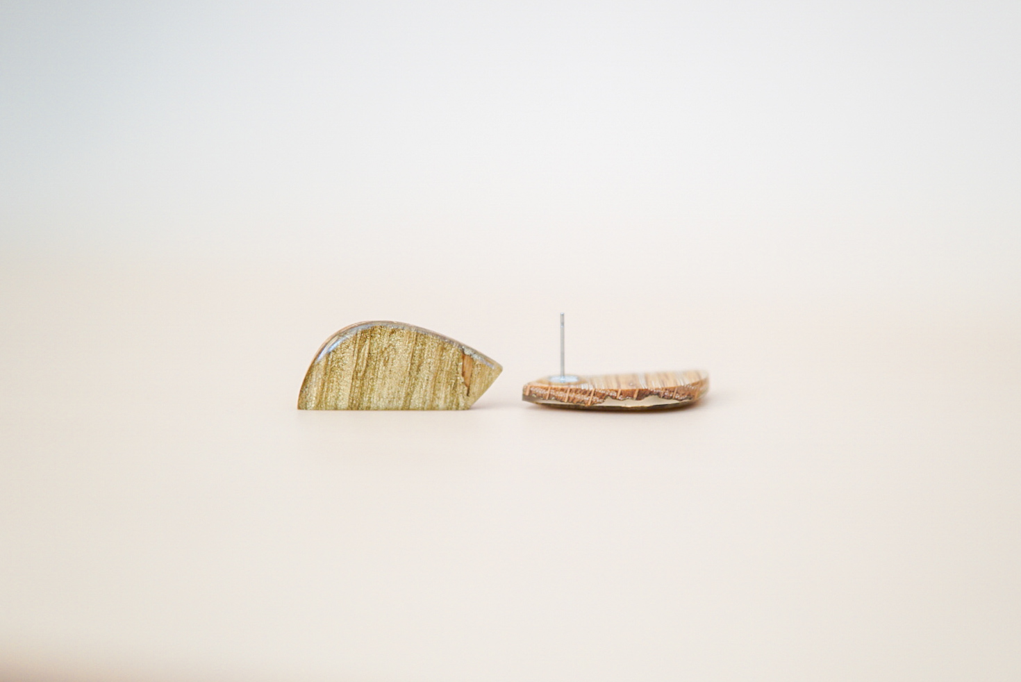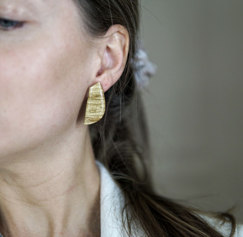 Käsitööna epoksiidvaigust ja tammepuidust valmistatud kuldset tooni sädelevad kõrvarõngad. Kõrvarõngaste pikkus on ca 3,5 cm, laius 1,5 cm ja paksus 0,4 cm. Kõrvarõngaste tagused on roostevabast terasest (nikli vabad).